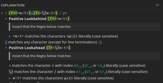 Part 3 can be found again in the contents of word/document.xml. Certain characters are singled out by xml tags.